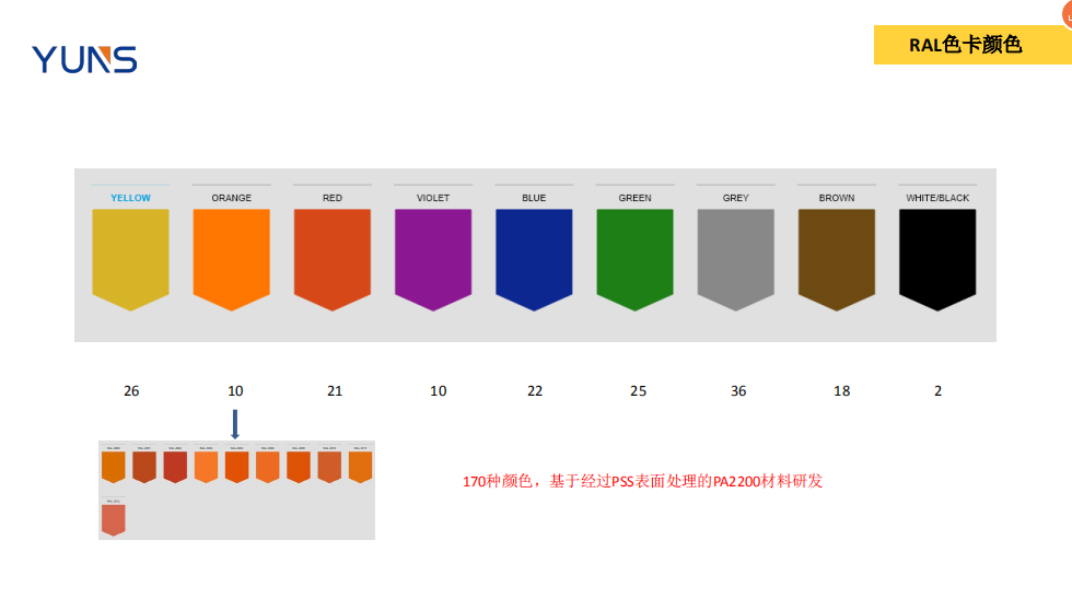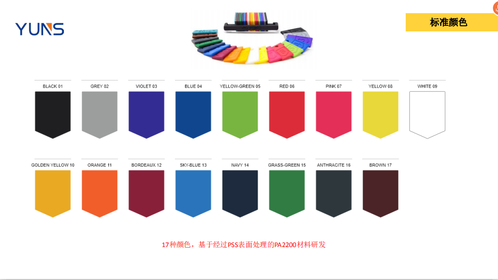1. 浸染顏色的色卡材料都是進(jìn)口EOS的PA12來做的,使用其他材料也會造成顏色偏差;